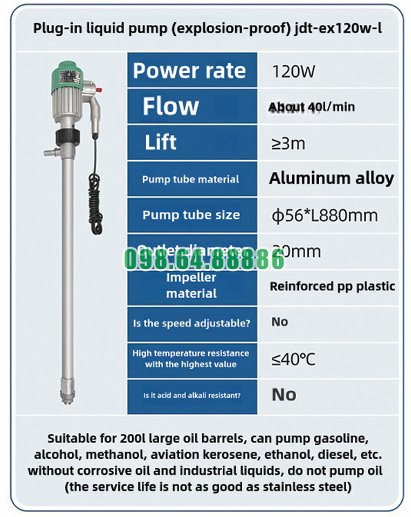 Máy bơm chất lỏng cầm tay chống cháy nổ JDT-EX120W-L phù hợp với các dung môi như xăng, ethanol, diesel – những chất thường xuyên xuất hiện tại trạm nhiên liệu.