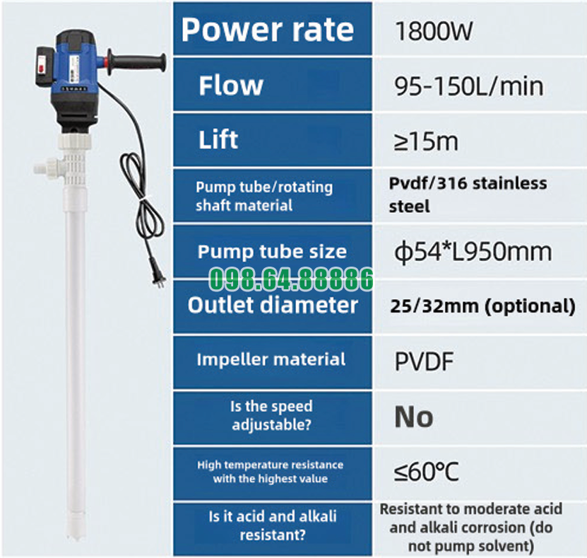 Nhờ những ưu điểm này, Máy bơm điện bơm chất lỏng thùng phuy JDT-1800W-PVDF trở thành lựa chọn đáng tin cậy cho nhiều ngành công nghiệp cần thiết bị bơm chất lỏng hiệu quả và ổn định trong sản xuất.