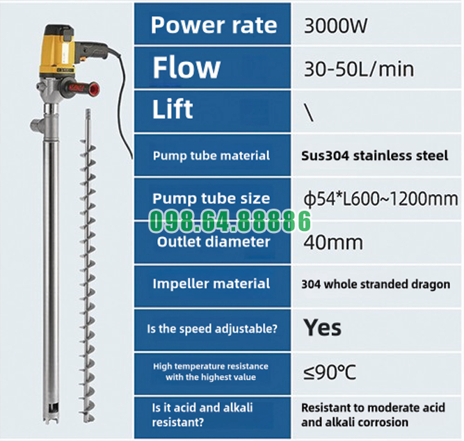 Máy bơm điện hút chất lỏng thùng phuy inox 304 công suất 3000W JDT-3000W-YT