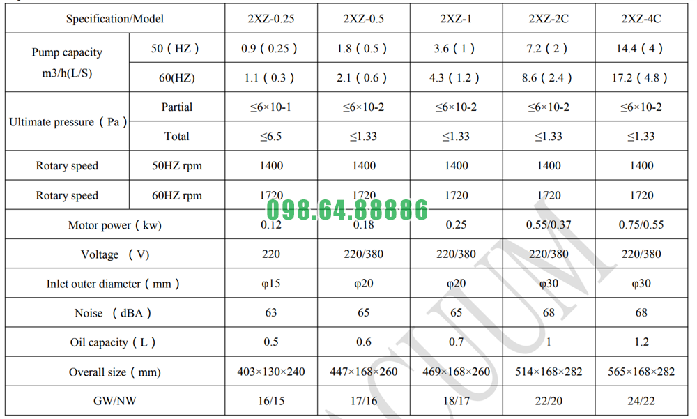 Bơm chân không thô model 2XZ-2 lưu lượng 7.2 m³
