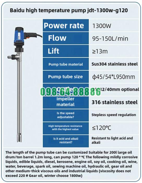 Điều này giúp bơm thùng phuy nhiệt độ cao JDT-1300W-G120 vận hành êm và ổn định trong thời gian dài.