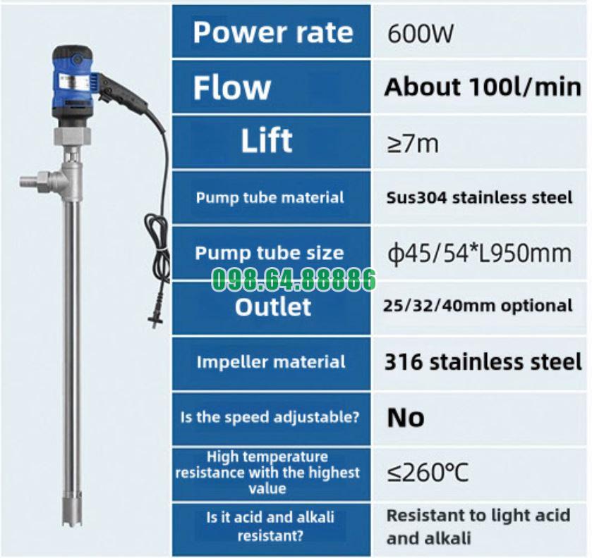 Bơm thùng phuy 200 lít chịu nhiệt JDT-600W-G260
