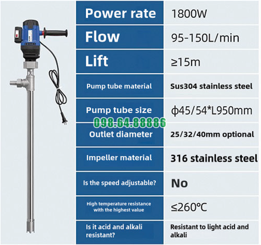 Khả năng chịu nhiệt là lợi thế cạnh tranh của Bơm thùng phuy lỏng nhiệt độ cao JDT-1800W-G260 được thể hiện rõ ràng qua thiết kế tổng thể và vật liệu cấu thành.