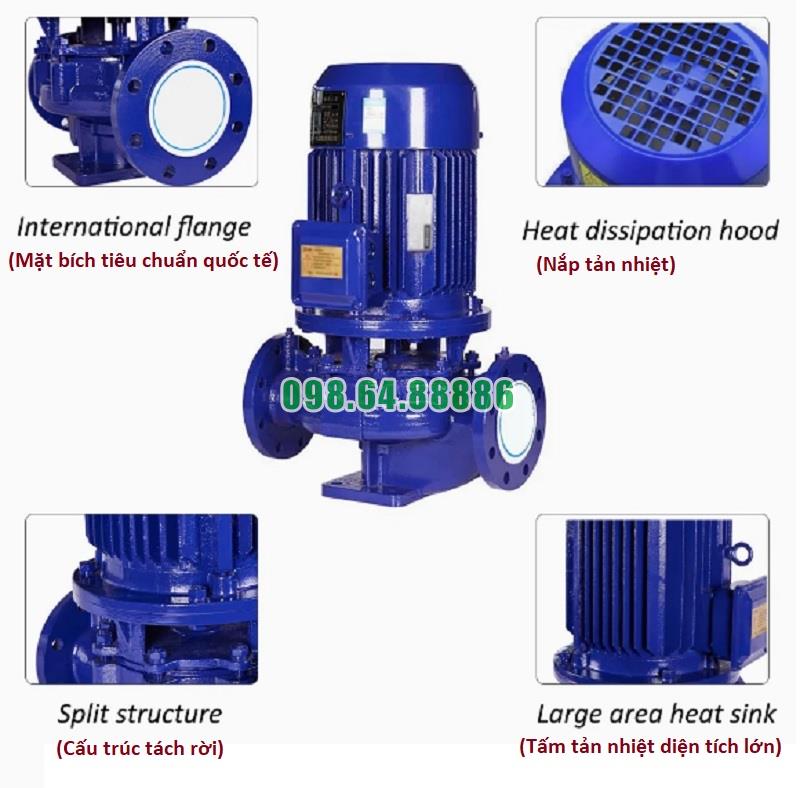 Máy bơm lùa, bơm trục đứng, bơm booster inline ISG80-100, IRG80-100 3kw, 50m3, 12.5m